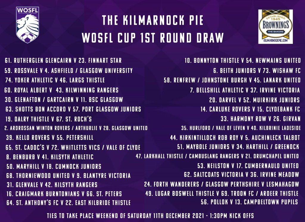 The draw for the first round of The Kilmarnock Pie WoSFL Cup will see the winners of the Ardrossan Winton Rovers-Arthurlie tie play at home to Glasgow United.