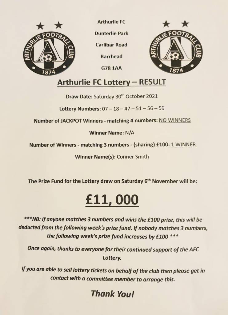 ARTHURLIE FC LOTTERY NEWS AFC LOTTERY | Result for 30/10/2021. Share this: Share on X (Opens in new window) X Share on Facebook (Opens in new window) Facebook Like Loading... Related