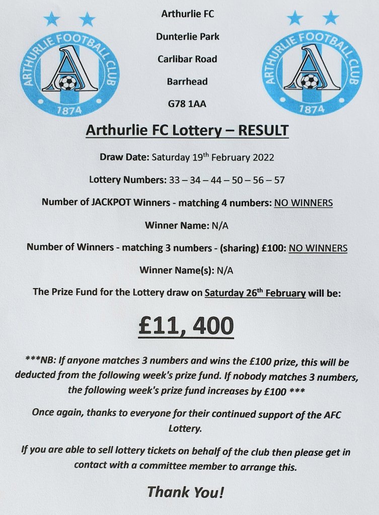ARTHURLIE FC LOTTERY NEWS AFC LOTTERY Result for 19/02/2022 Share this: Share on X (Opens in new window) X Share on Facebook (Opens in new window) Facebook Like Loading... Related