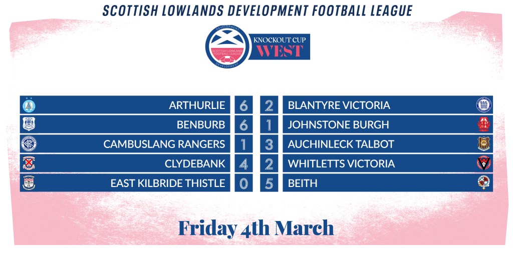UNDER-20S RESULT: ARTHURLIE 6-2 BLANTYRE VICS SLDFL Knockout Cup West Goalscorers: Healy, O’Hare (4) & Ingram Team Full results Share this: Share on X (Opens in new window) X Share on Facebook (Opens in new window) Facebook Like Loading... Related