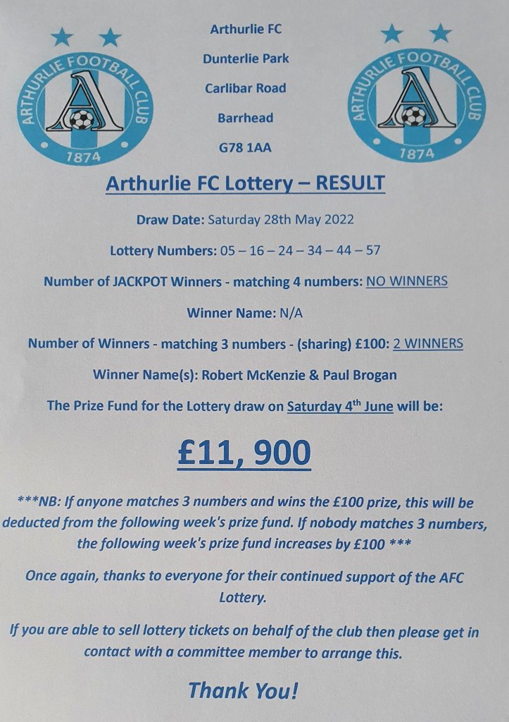 ARTHURLIE FC LOTTERY NEWS AFC LOTTERY Result for 28/05/2022 Share this: Click to share on X (Opens in new window) X Click to share on Facebook (Opens in new window) Facebook Like Loading... Related