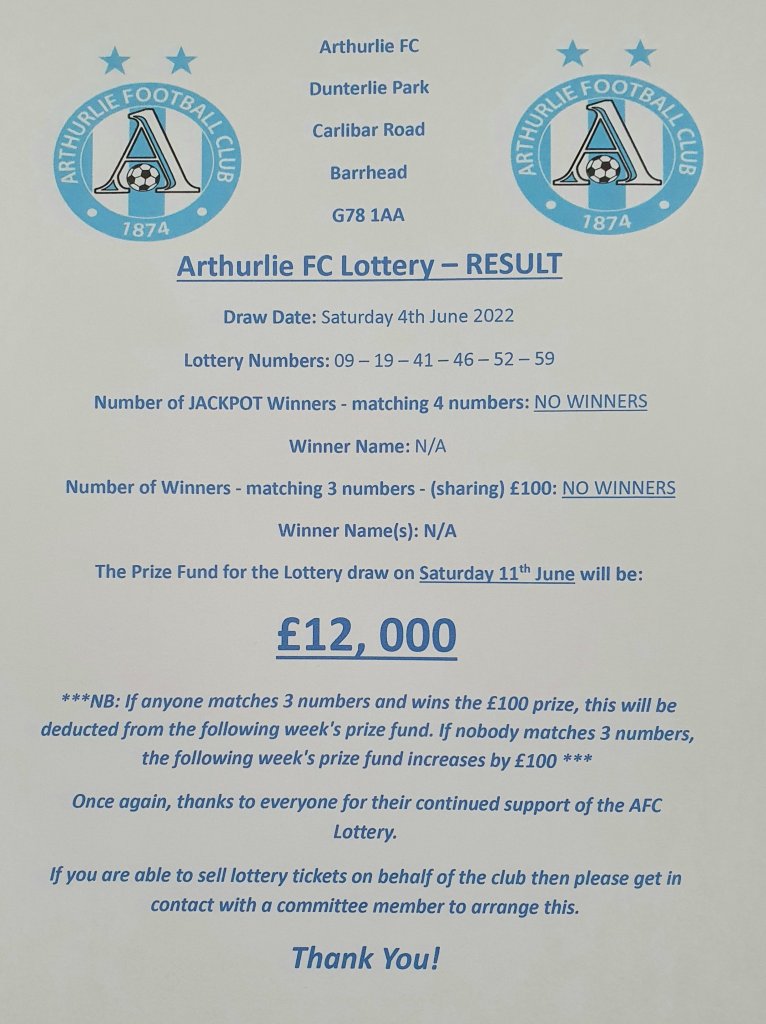 ARTHURLIE FC LOTTERY NEWS AFC LOTTERY Result for 04/06/2022 Share this: Click to share on X (Opens in new window) X Click to share on Facebook (Opens in new window) Facebook Like Loading... Related