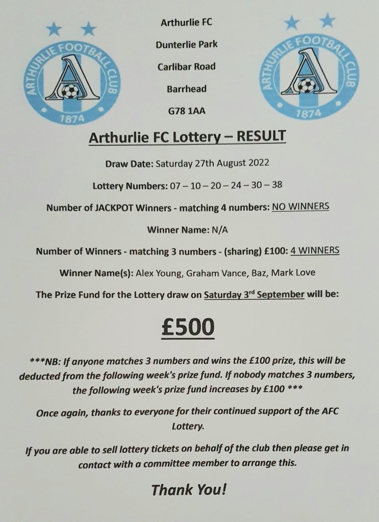 ARTHURLIE FC LOTTERY NEWS AFC LOTTERY Result for 27/08/2022 Share this: Click to share on X (Opens in new window) X Click to share on Facebook (Opens in new window) Facebook Like Loading... Related