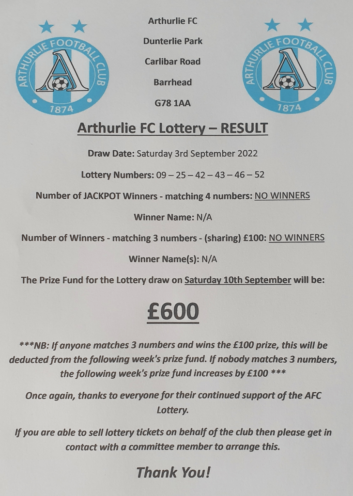 ARTHURLIE FC LOTTERY NEWS AFC LOTTERY Result for 03/09/2022 Share this: Click to share on X (Opens in new window) X Click to share on Facebook (Opens in new window) Facebook Like Loading... Related