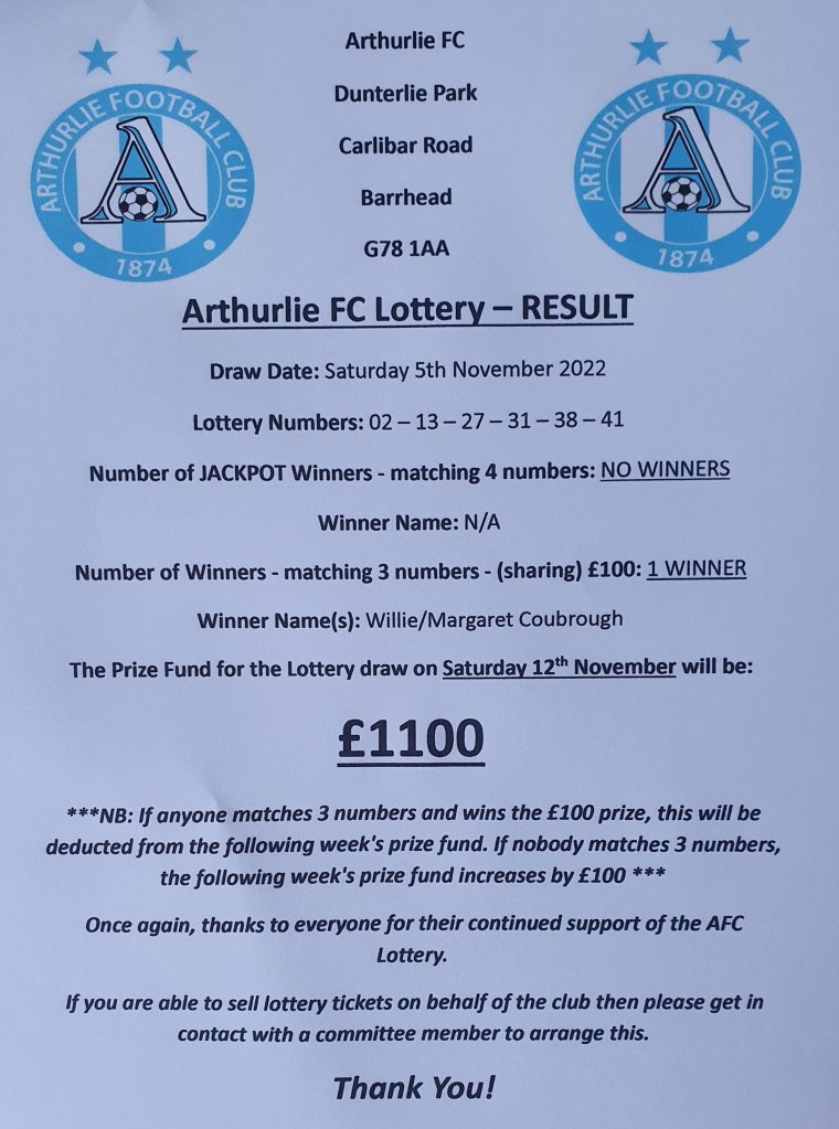 ARTHURLIE FC LOTTERY NEWS AFC LOTTERY Result for 05/11/2022 Share this: Click to share on X (Opens in new window) X Click to share on Facebook (Opens in new window) Facebook Like Loading... Related