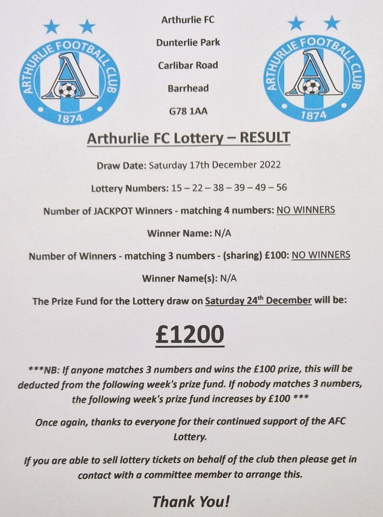 ARTHURLIE FC LOTTERY NEWS AFC LOTTERY Result for 17/12/2022 Share this: Click to share on X (Opens in new window) X Click to share on Facebook (Opens in new window) Facebook Like Loading... Related
