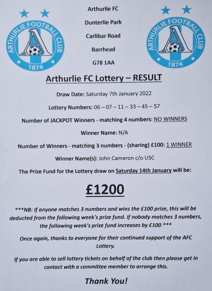 ARTHURLIE FC LOTTERY NEWS AFC LOTTERY Result for 07/01/2023 Share this: Click to share on X (Opens in new window) X Click to share on Facebook (Opens in new window) Facebook Like Loading... Related