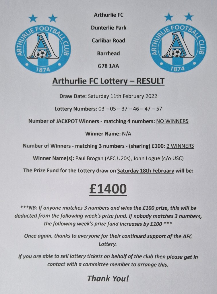ARTHURLIE FC LOTTERY NEWS AFC LOTTERY Result for 11/02/2023 Share this: Click to share on X (Opens in new window) X Click to share on Facebook (Opens in new window) Facebook Like Loading... Related