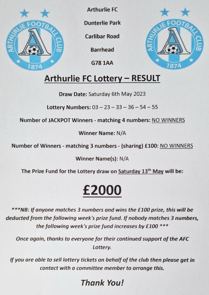 ARTHURLIE FC LOTTERY NEWS AFC LOTTERY Result for 06/05/2023 Share this: Click to share on X (Opens in new window) X Click to share on Facebook (Opens in new window) Facebook Like Loading... Related