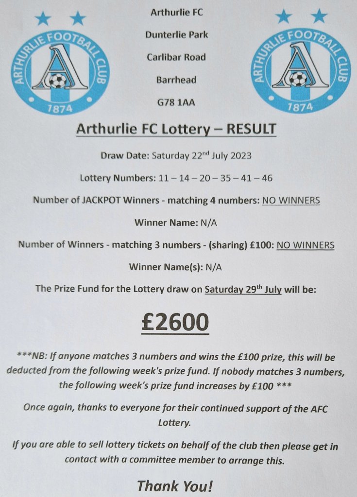 ARTHURLIE FC LOTTERY NEWS AFC LOTTERY Result for 22/07/2023 Share this: Click to share on X (Opens in new window) X Click to share on Facebook (Opens in new window) Facebook Like Loading... Related