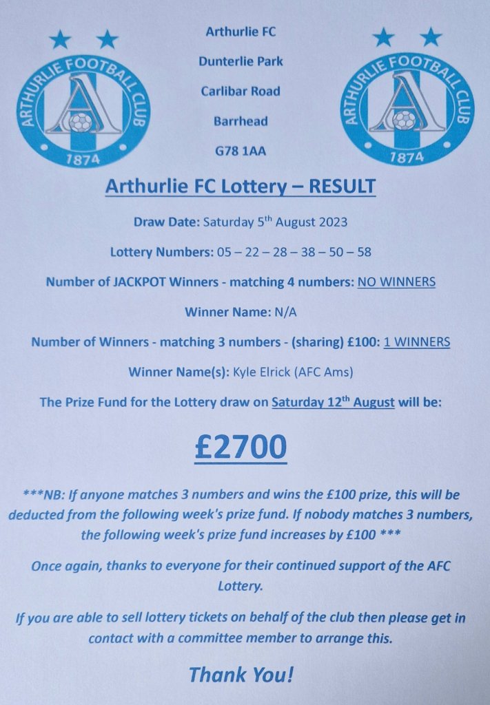 ARTHURLIE FC LOTTERY NEWS AFC LOTTERY Result for 05/08/2023 Share this: Click to share on X (Opens in new window) X Click to share on Facebook (Opens in new window) Facebook Like Loading... Related