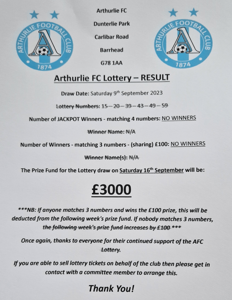 ARTHURLIE FC LOTTERY NEWS AFC LOTTERY Result for 09/09/2023 Share this: Click to share on X (Opens in new window) X Click to share on Facebook (Opens in new window) Facebook Like Loading... Related
