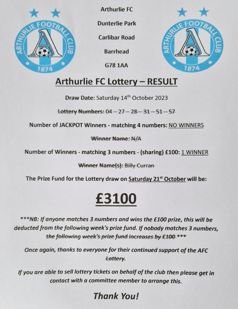 ARTHURLIE FC LOTTERY NEWS AFC LOTTERY Result for 14/10/2023 Share this: Click to share on X (Opens in new window) X Click to share on Facebook (Opens in new window) Facebook Like Loading... Related