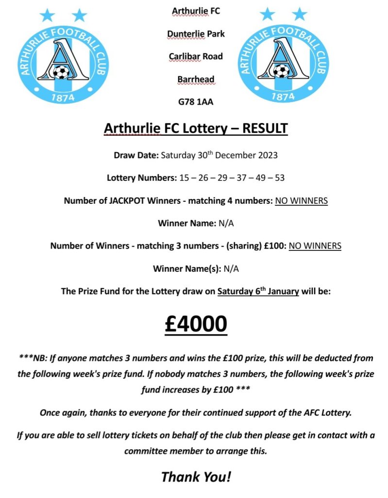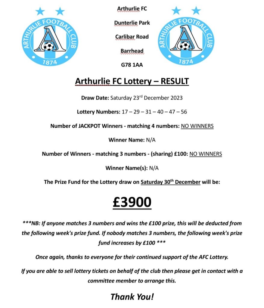 ARTHURLIE FC LOTTERY NEWS AFC LOTTERY Result for 30/12/2023 AFC LOTTERY Result for 23/12/2023 Share this: Click to share on X (Opens in new window) X Click to share on Facebook (Opens in new window) Facebook Like Loading... Related