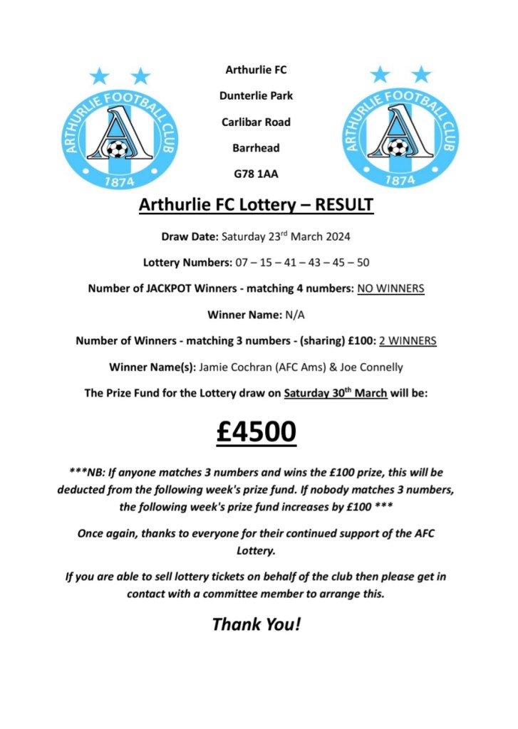ARTHURLIE FC LOTTERY NEWS AFC LOTTERY Result for 23/03/2024 Share this: Click to share on X (Opens in new window) X Click to share on Facebook (Opens in new window) Facebook Like Loading... Related