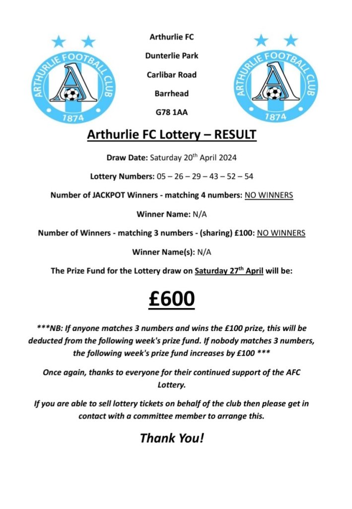 ARTHURLIE FC LOTTERY NEWS AFC LOTTERY Result for 20/04/2024 Share this: Click to share on X (Opens in new window) X Click to share on Facebook (Opens in new window) Facebook Like Loading... Related