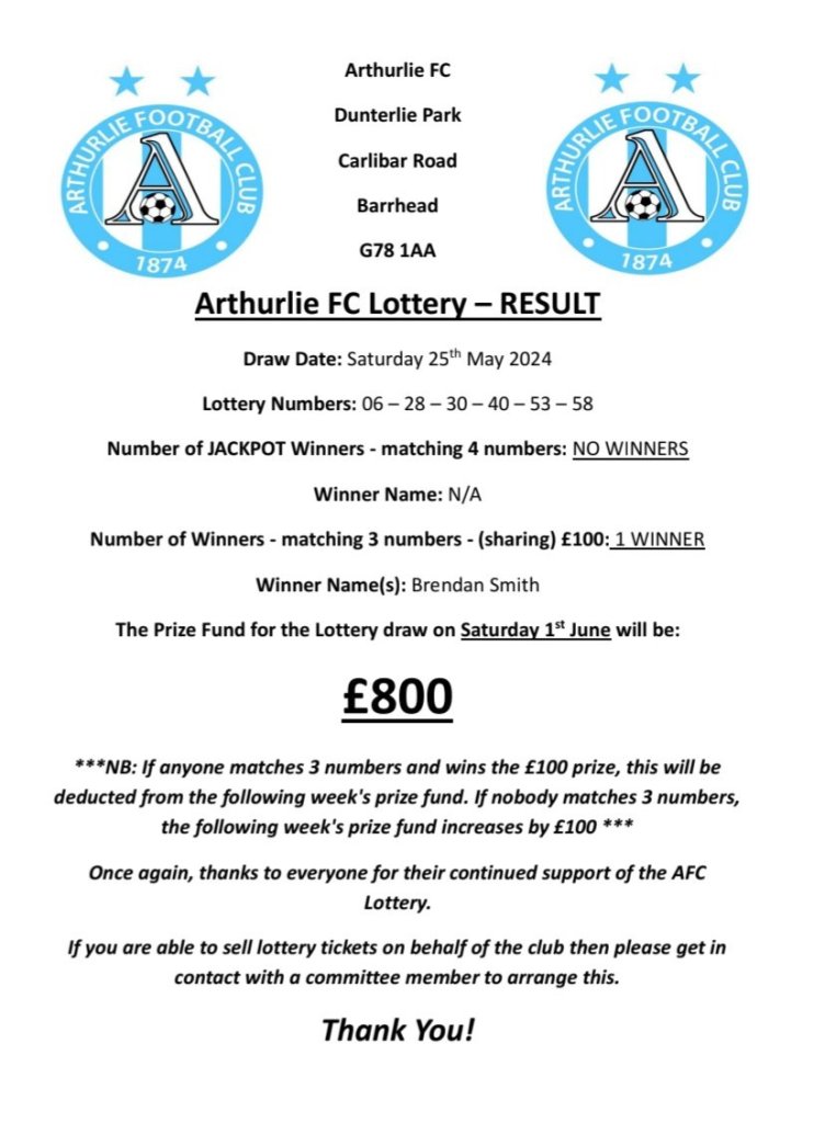 ARTHURLIE FC LOTTERY NEWS AFC LOTTERY Result for 25/05/2024 Share this: Click to share on X (Opens in new window) X Click to share on Facebook (Opens in new window) Facebook Like Loading... Related