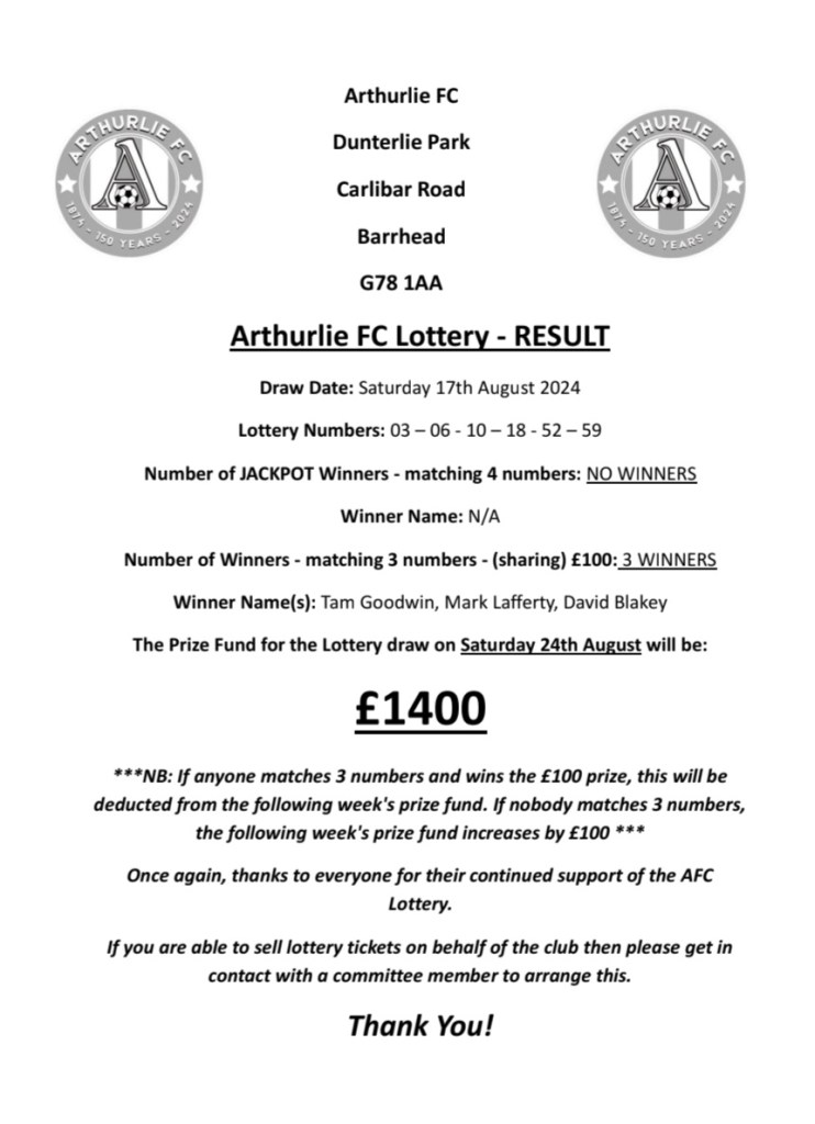 ARTHURLIE FC LOTTERY NEWS AFC LOTTERY Result for 17/08/2024 Share this: Click to share on X (Opens in new window) X Click to share on Facebook (Opens in new window) Facebook Like Loading... Related