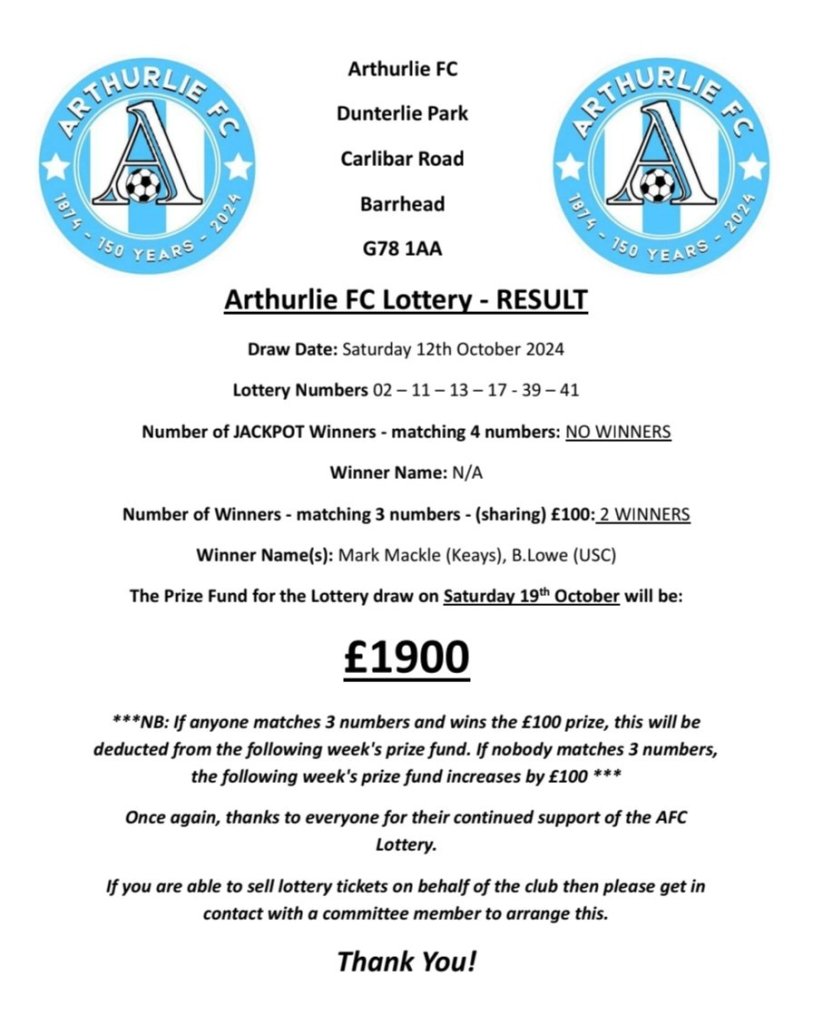 ARTHURLIE FC LOTTERY NEWS AFC LOTTERY Result for 12/10/2024 Share this: Click to share on X (Opens in new window) X Click to share on Facebook (Opens in new window) Facebook Like Loading... Related
