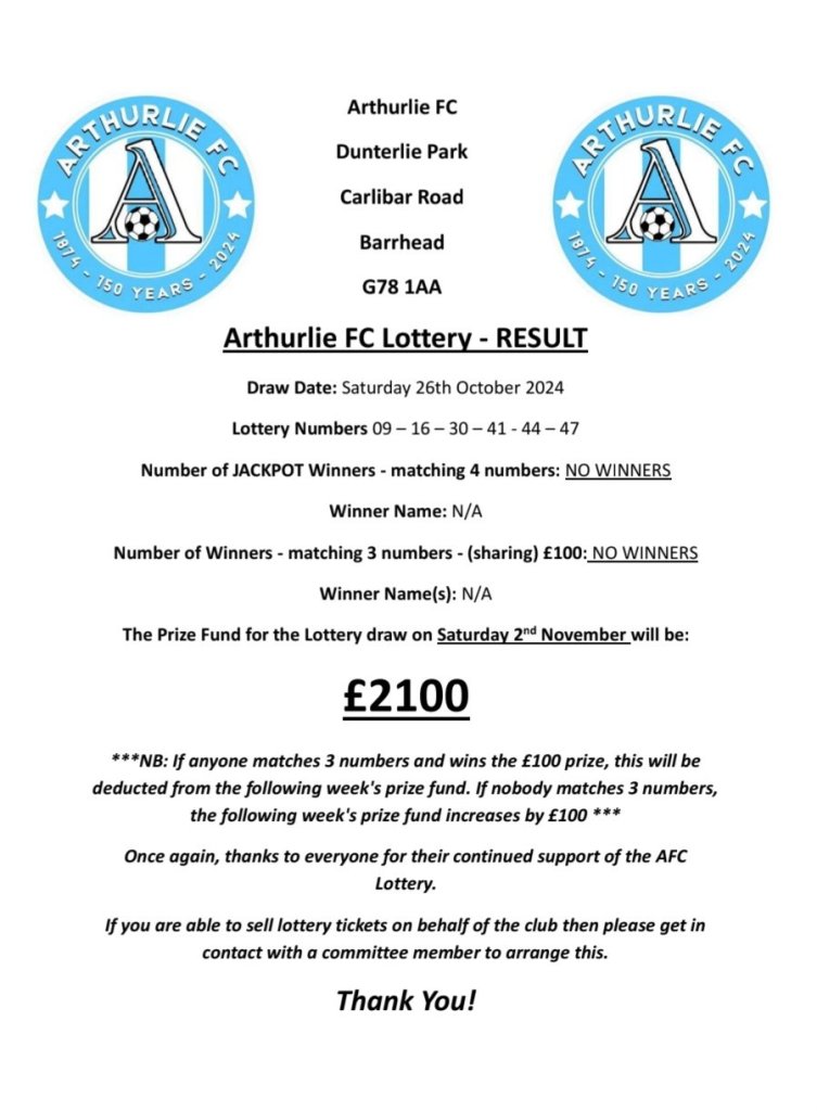 ARTHURLIE FC LOTTERY NEWS AFC LOTTERY Result for 26/10/2024 Share this: Click to share on X (Opens in new window) X Click to share on Facebook (Opens in new window) Facebook Like Loading... Related