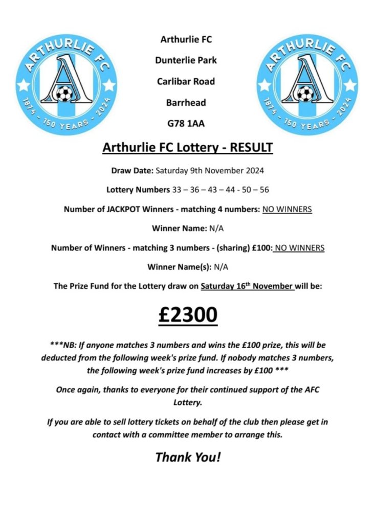 ARTHURLIE FC LOTTERY NEWS AFC LOTTERY Result for 09/11/2024 Share this: Click to share on X (Opens in new window) X Click to share on Facebook (Opens in new window) Facebook Like Loading... Related