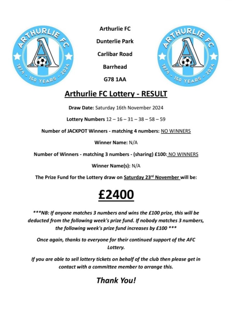 ARTHURLIE FC LOTTERY NEWS AFC LOTTERY Result for 16/11/2024 Share this: Click to share on X (Opens in new window) X Click to share on Facebook (Opens in new window) Facebook Like Loading... Related