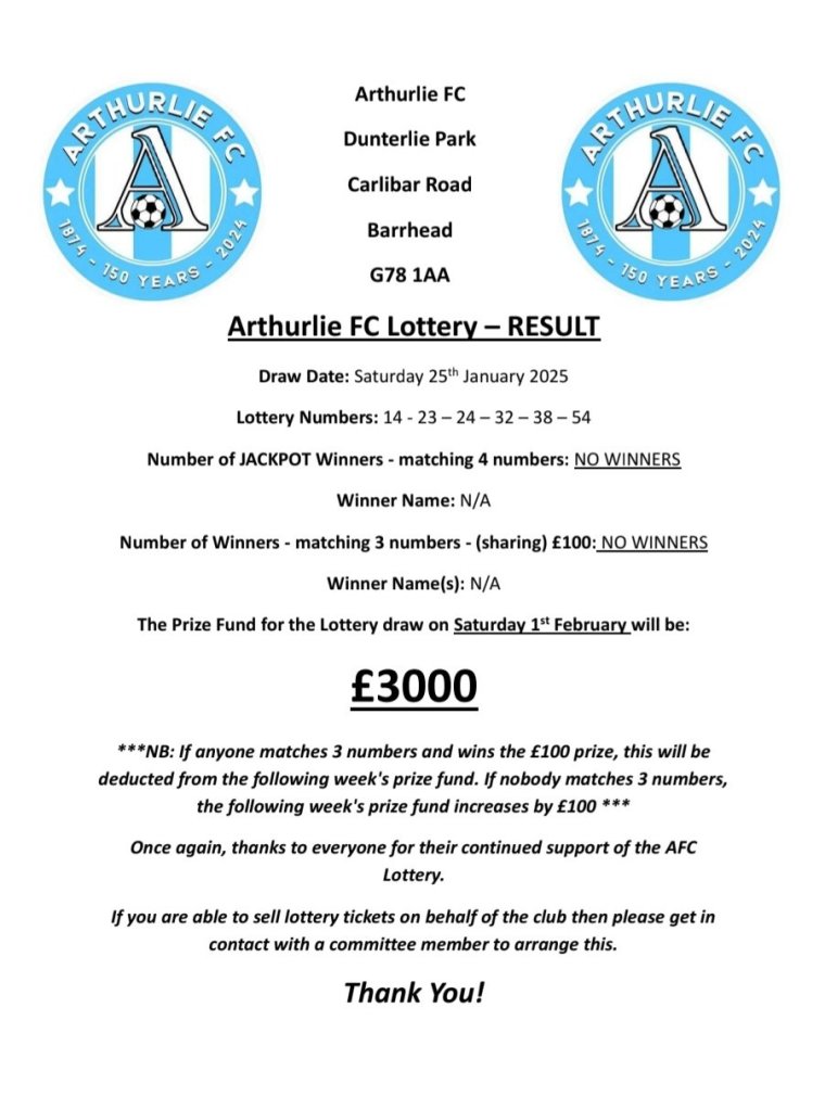ARTHURLIE FC LOTTERY NEWS AFC LOTTERY Result for 25/01/2025 Share this: Click to share on X (Opens in new window) X Click to share on Facebook (Opens in new window) Facebook Like Loading... Related