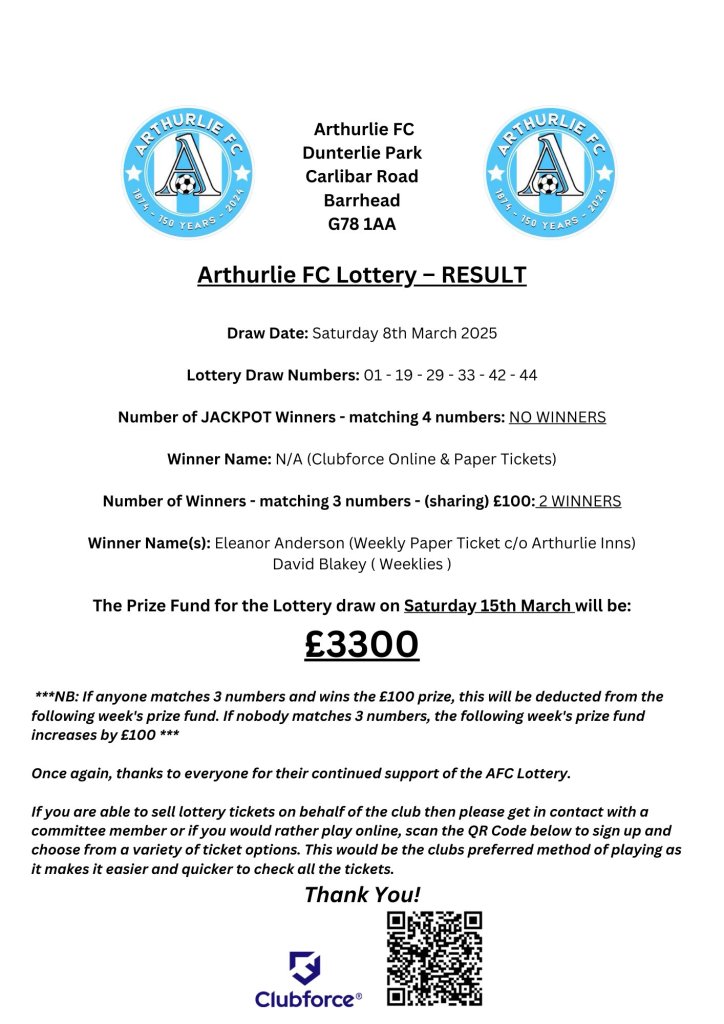 ARTHURLIE FC LOTTERY NEWS AFC LOTTERY Result for 08/03/2025 Share this: Click to share on X (Opens in new window) X Click to share on Facebook (Opens in new window) Facebook Like Loading... Related