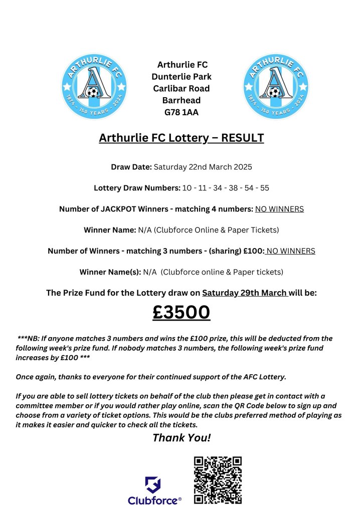 ARTHURLIE FC LOTTERY NEWS AFC LOTTERY Result for 22/03/2025 Share this: Click to share on X (Opens in new window) X Click to share on Facebook (Opens in new window) Facebook Like Loading... Related