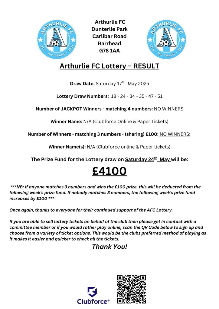 ARTHURLIE FC LOTTERY NEWS AFC Lottery Result for 17/05/2025. Share this: Click to share on X (Opens in new window) X Click to share on Facebook (Opens in new window) Facebook Like Loading... Related