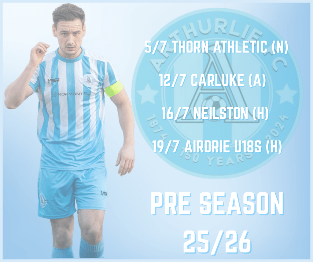 The players and new management team return to pre season training on 28/06/25. We have four friendlies scheduled so far kicking off against Thorn Athletic on Saturday 5th July and Renfrew leisure centre. The following week we travel to Carluke, please note this game is a closed doors game so no fans are allowed. Wednesday 16th we take on Neilston at Dunterlie before finishing off our preparations against Airdrie u18s on Saturday 19th again down at Dunterlie.